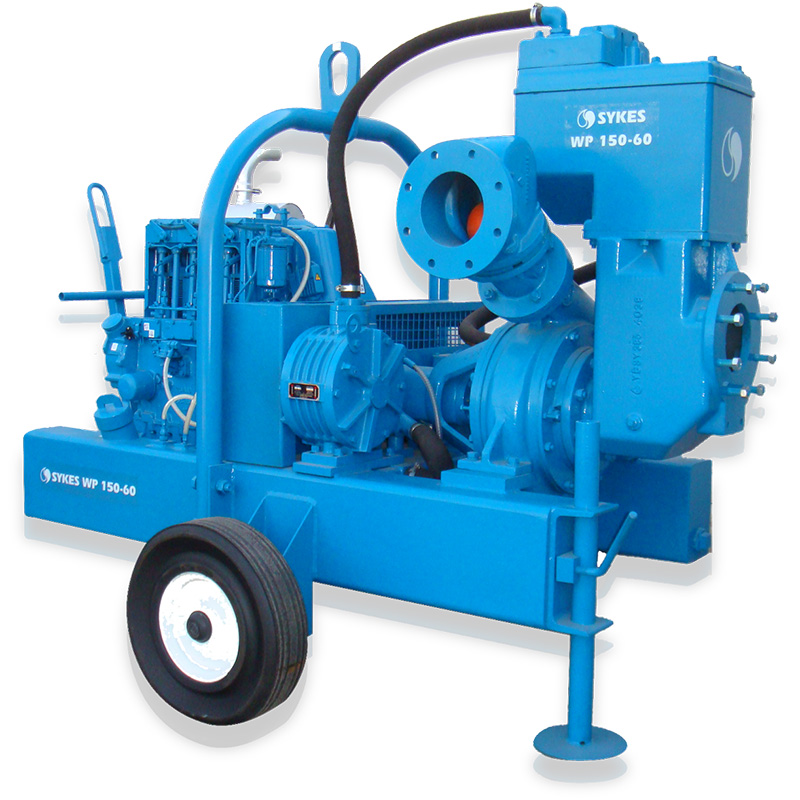 The WP150/60 is a specifically designed pump set, to handle clean or dirty water containing limited solids. The WP150 is used extensively on construction sites for dewatering, by oil companies, municipalities and utilities, and for marine and agricultural applications. The WP150/60 incorporates the unique Sykes Univac high flow automatic vacuum system. This enables the pump to prime and re-prime fully automatically, allowing for fast draw down and excellent air handling characteristics enabling the pump set to maintain constant vacuum when used on wellpoint systems. A lister air cooled diesel engine is offered as standard with alternative engines, motors and chassis configurations.